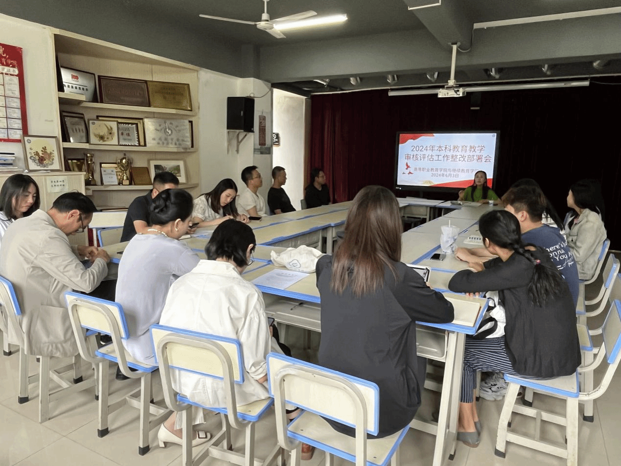 2026世界杯官网于2024年6月3日中午12点半在综合楼506会议室召开本科公司产品审核评估工作整改部署会,由2026世界杯官网副经理张文君主持。2026世界杯官网全体教职工参加了此次会议。