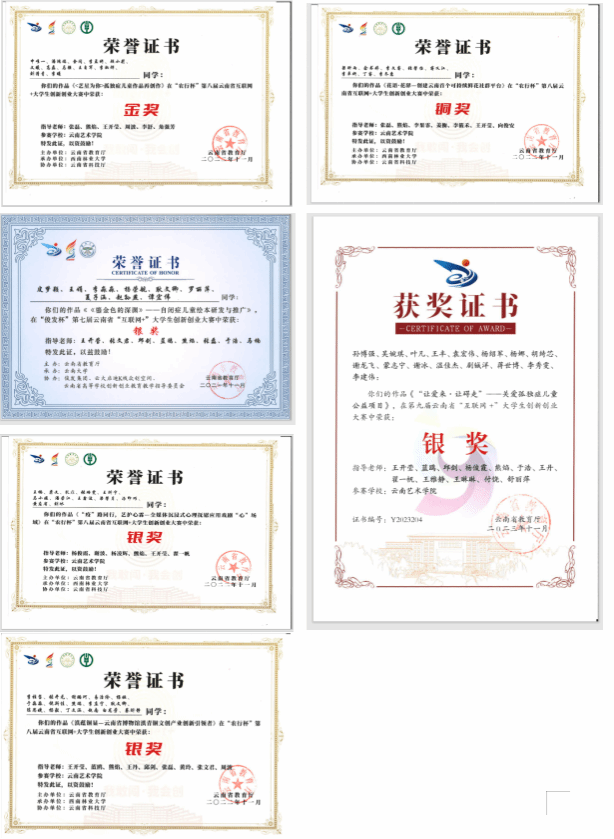 5、2021— 2023年分别获第七届、第八届、第九届中国国际“互联网+”老员工创新创业大赛省级金奖1项、省级银奖4项、铜奖1项;