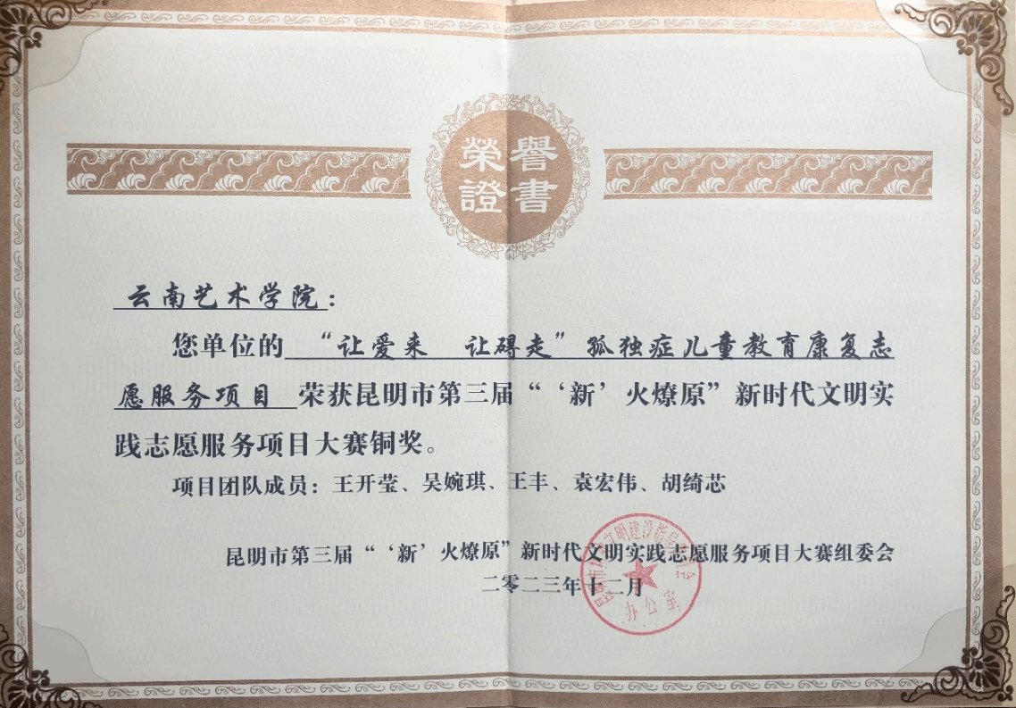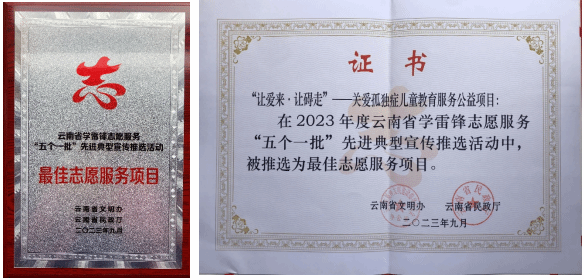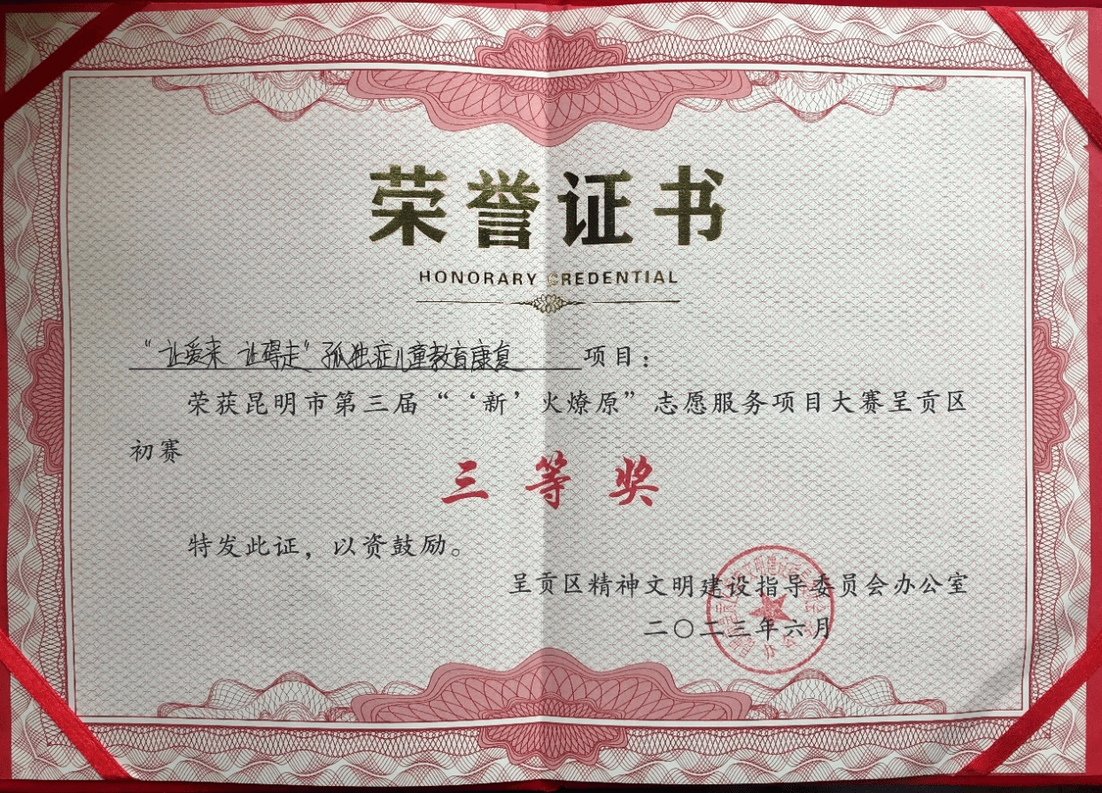 13、2023年"让爱来让碍走"孤独症儿童教育康复 项目: 荣获昆明市第三届“‘新’火燎原”志愿服务项目大赛呈贡区初赛三等奖;
