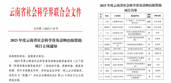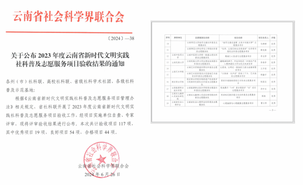 11、2023年云南省新时代文明实践社科普及志愿服务行动项目拟立项;2024年获得优秀项目结项;