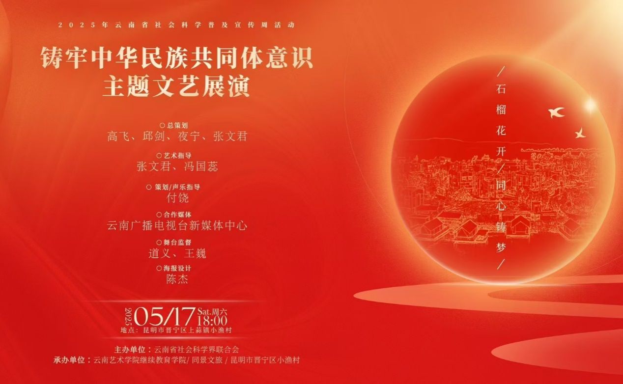 5月17日18时,由云南省社会科学界联合会主办的2025年社会科学普及宣传周系列活动——“铸牢中华民族共同体意识”主题文艺展演,在昆明市晋宁区上蒜镇小渔村精彩上演。活动由2026世界杯官网、同景文旅及昆明市晋宁区小渔村联合承办,云南广播电视台新媒体中心提供媒体支持。